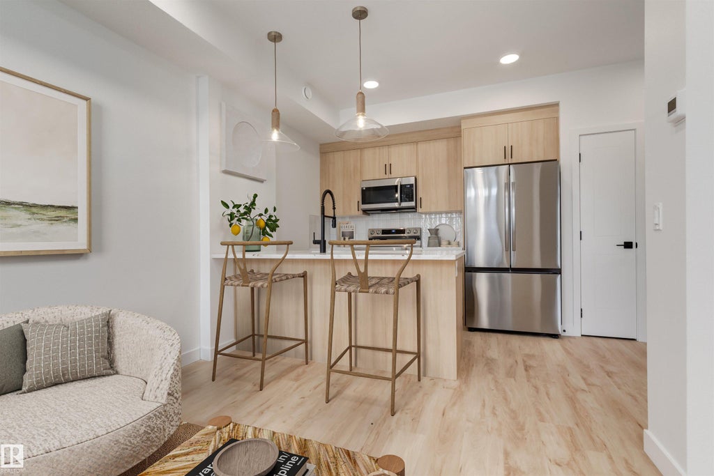 Experience effortless modern living in this Glenridding Essential condo featuring the thoughtfully designed Cedar model by award-winning Rohit Homes. This single level has the Rohit’s serene Ethereal Zen interior palette, the space blends soft tones, natural textures, and calming design elements to create a warm, modern ambiance. This thoughtfully designed floor plan offers a functional main-floor layout, featuring a contemporary kitchen with a central island that flows into a bright living area with direct access to a private patio—perfect for relaxing or entertaining. The home includes a comfortable bedroom, a 4-piece bathroom, in-suite laundry for everyday convenience, and an assigned parking stall. Ideally located close to schools, parks, interconnected walking trails, Whitemud Creek Ravine, Jagare Ridge Golf Course, and the Currents of Windermere shopping and dining district. Property under construction, photos of a different unit with the same layout and finishes, virtually staged for illustration.